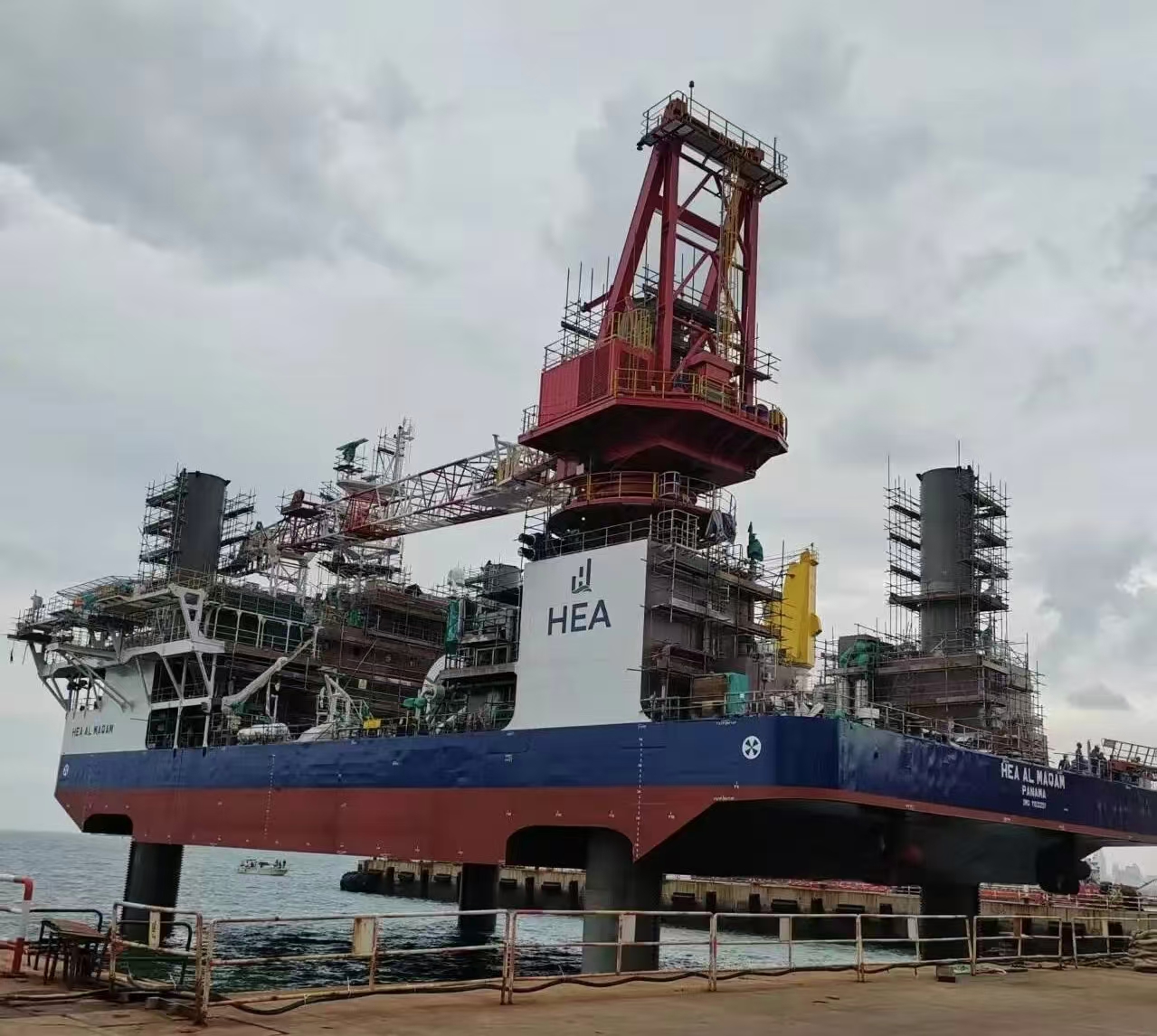 9月27日,TYPE3 PRO第二座自升式海上作業(yè)支持平臺下水后,經(jīng)過升降系統(tǒng)調(diào)試,四條樁腿平穩(wěn)扎進(jìn)海底實現(xiàn)了平臺站樁,隨后開展了平臺樁腿接長工作。